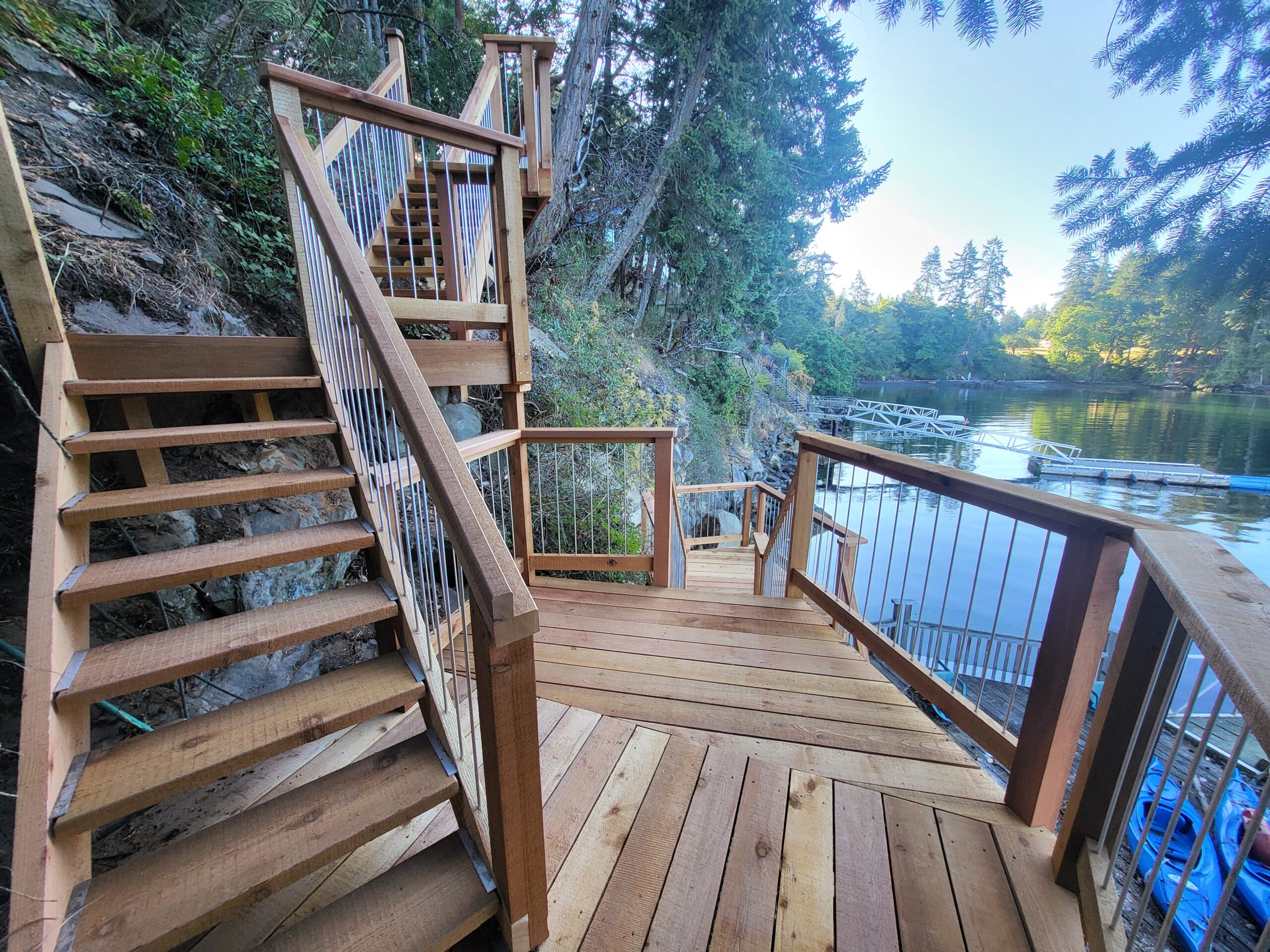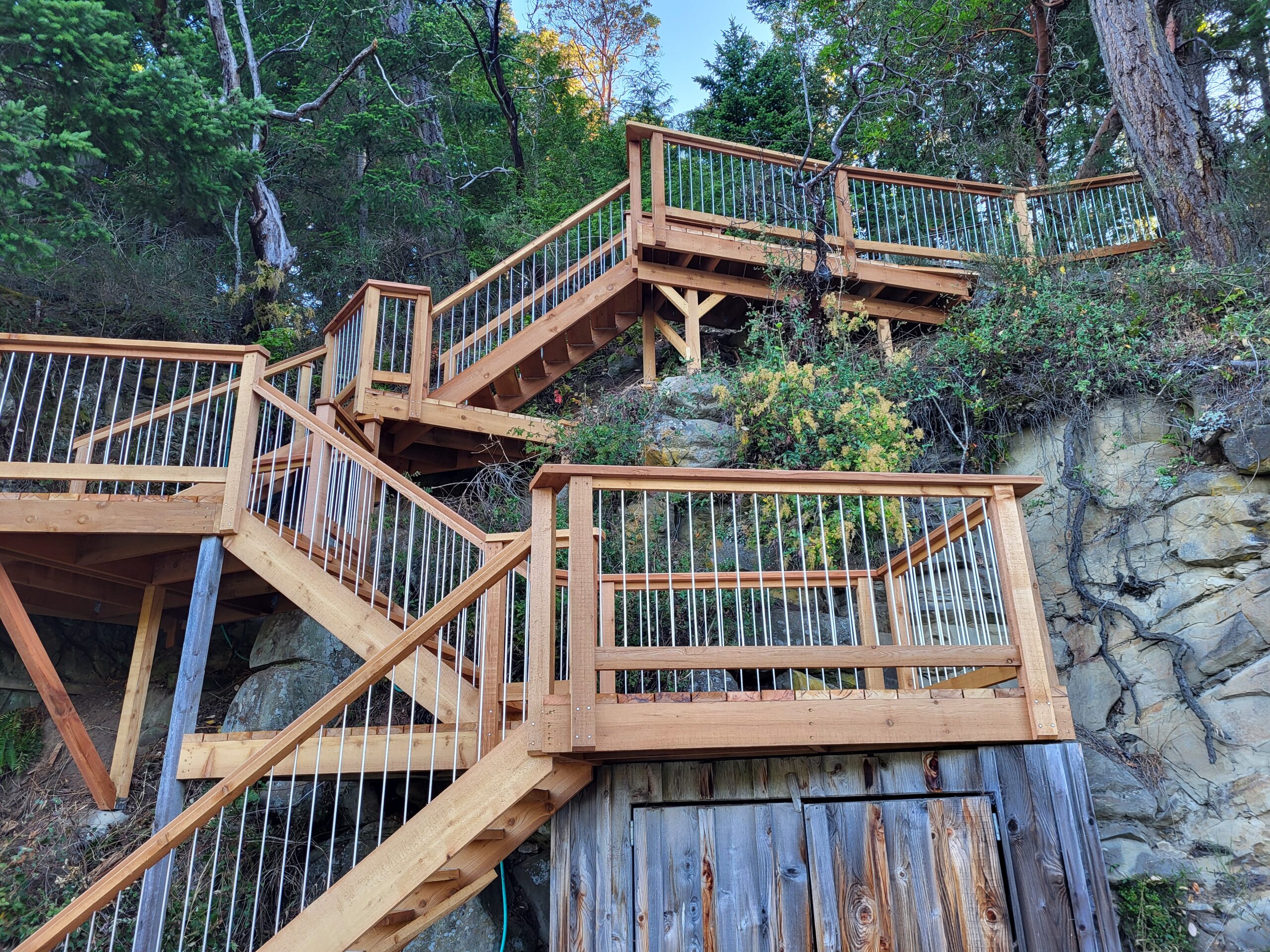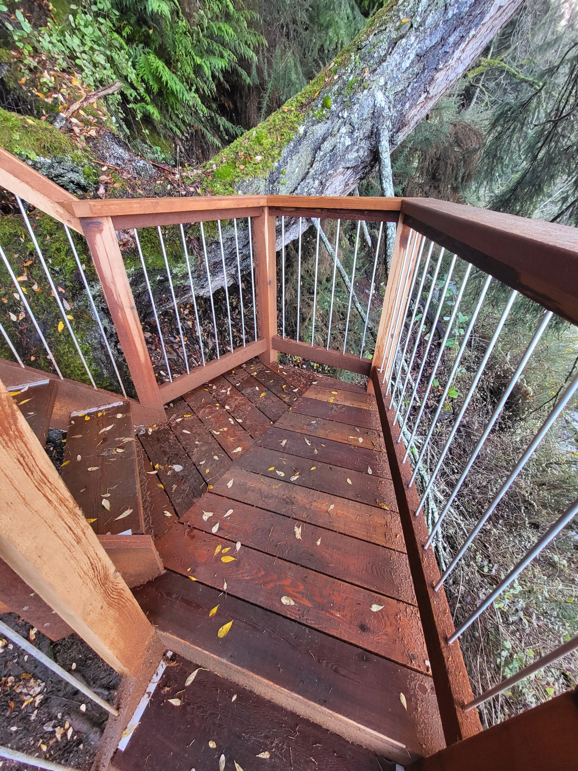 Old growth cedar with aluminum spindles and custom tread holders